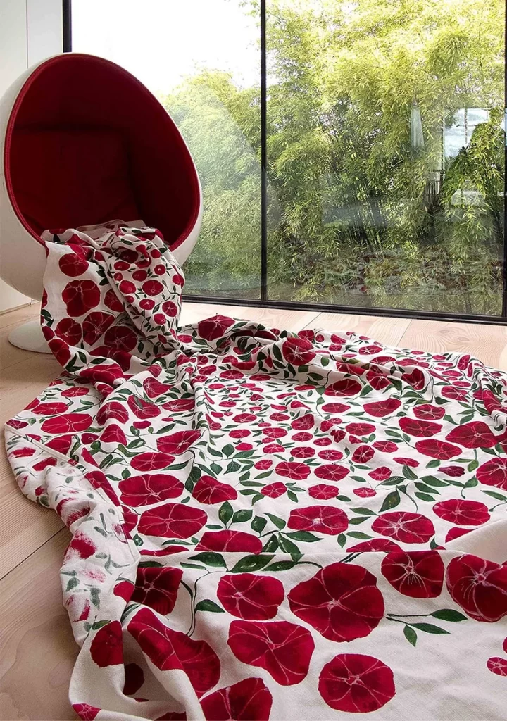 A quick technical inspection is all she needs to follow her creative instincts and envision the new life of items like tablecloths, tapestries, or cushions designed specifically for her clients’ homes. Her fabrics tell stories inspired by dragonflies, golden-striped leaves, and hydrangeas, often drawing influence from the flowers found in Notting Hill’s municipal gardens. The essence of the Mediterranean also resonates in her work, reflected in fields of red flowers reminiscent of Slim Aarons‘ iconic photograph, “Dining al Fresco in Capri.”