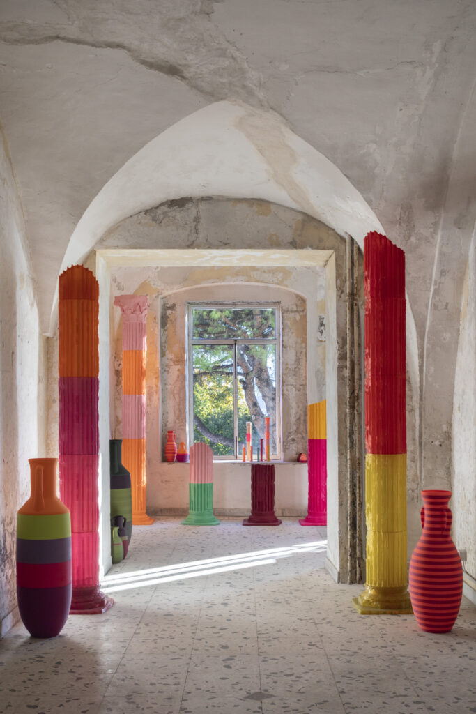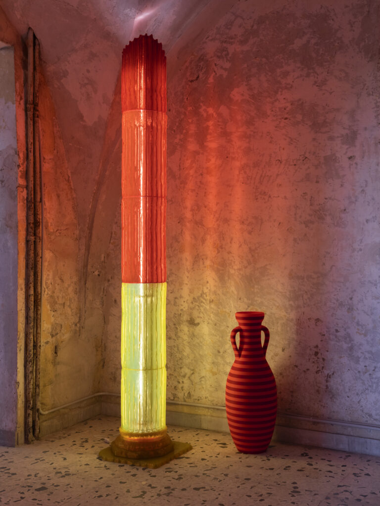 The centerpiece is Dafne, a column inspired by the Temple of the Dioscuri, Castor and Pollux, in the Roman Forum. Pop Pot translates the column’s archetype through contemporary fabrication and sustainable materials, establishing a living dialogue between the ancient and the digital. Like the amphorae that inaugurated the brand’s journey, Dafne is produced via large-format 3D printing, using bio-based, compostable PLA for indoor applications and recycled PETG for outdoor use.