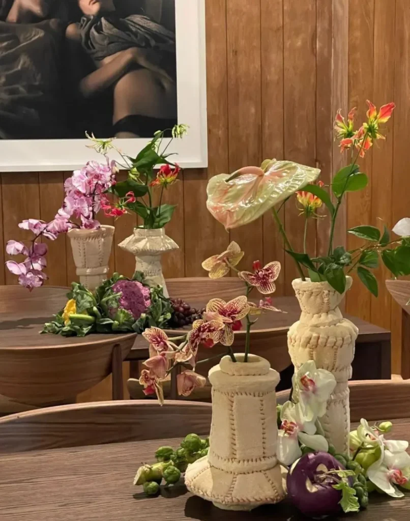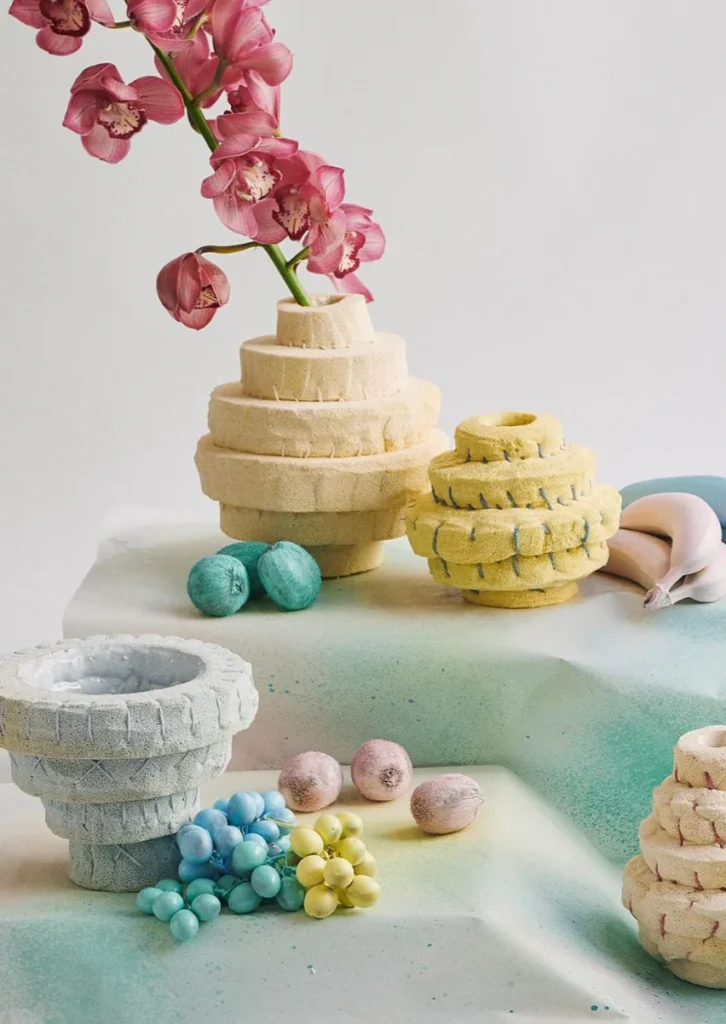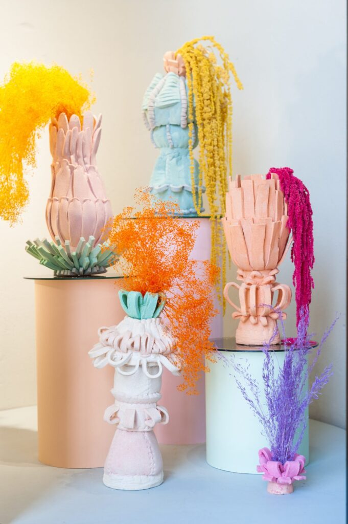 One of the most recognizable directions in her work is a series of foam vessels and sculptural containers that seem poised to “bloom” on a table. These pieces often balance organic volume with structured detailing, making them equally at home in a design collection or a curated living space.