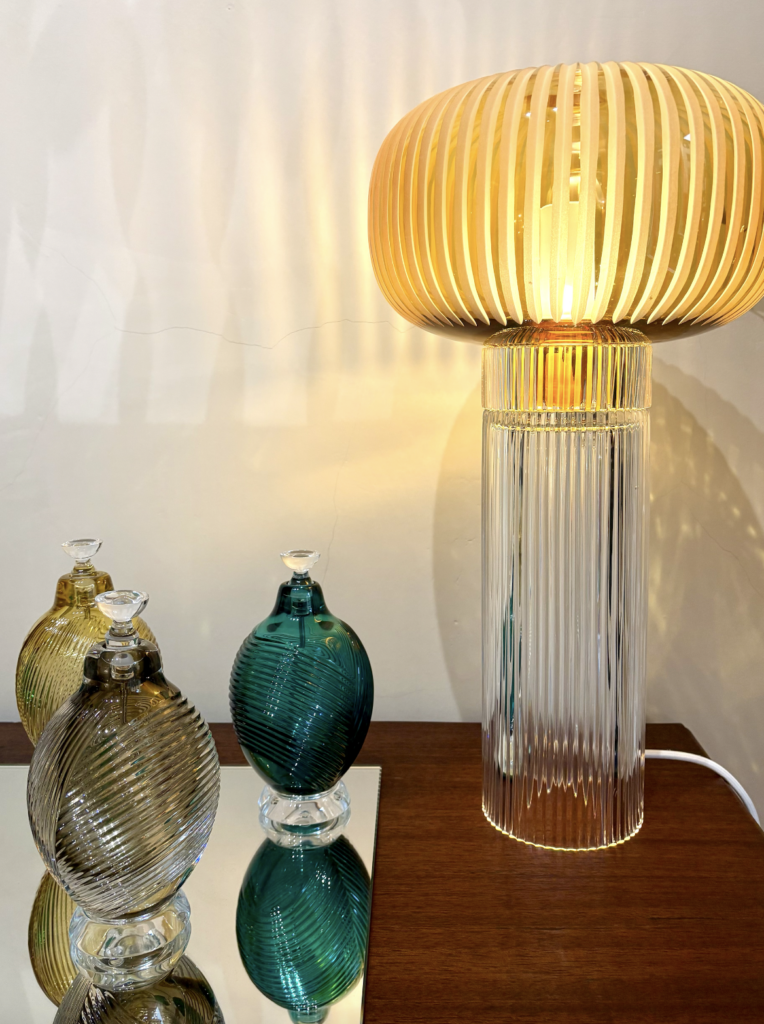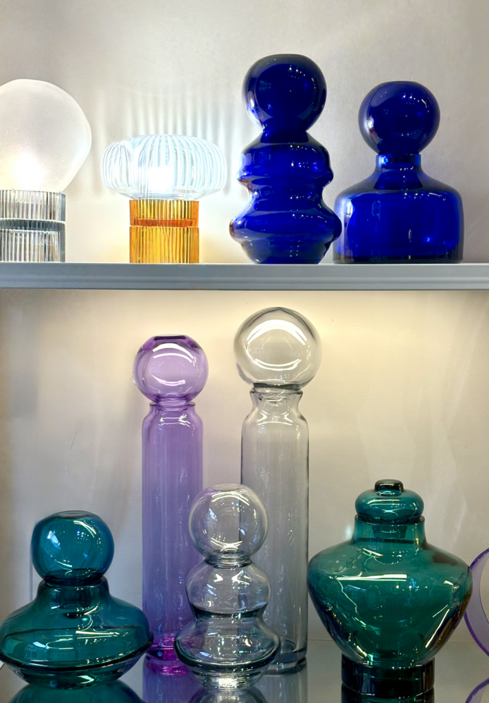 Stepping into the space, a series of vases whose sinuous curves echo the female form draws our gaze. From cobalt blue to amber yellow, from dusty rose to deep teal, these bottle-shaped vases compose a small architecture of color. Reflections shift with every step, and the play of light effortlessly furnishes the room. Here, artisanal design reveals what it truly is—a living practice capable of uniting function and poetry, technique and intuition.