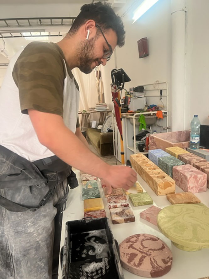 A short walk away from the Locke de Santa Joana, next to Parque Eduardo VII, we encountered Tosco Studio’s workspace during their creative daily routine. It was fascinating meeting the guys at work. We took a sneak peek inside and had a quick conversation about their mission to transform concrete into sculptural, handcrafted pieces and turning design into an art form. Colorful tiles and sophisticated shapes and forms fill their lab with such allure that you’d want to touch each piece. Their color combinations and the concrete’s outcomes they work with are exceptional.