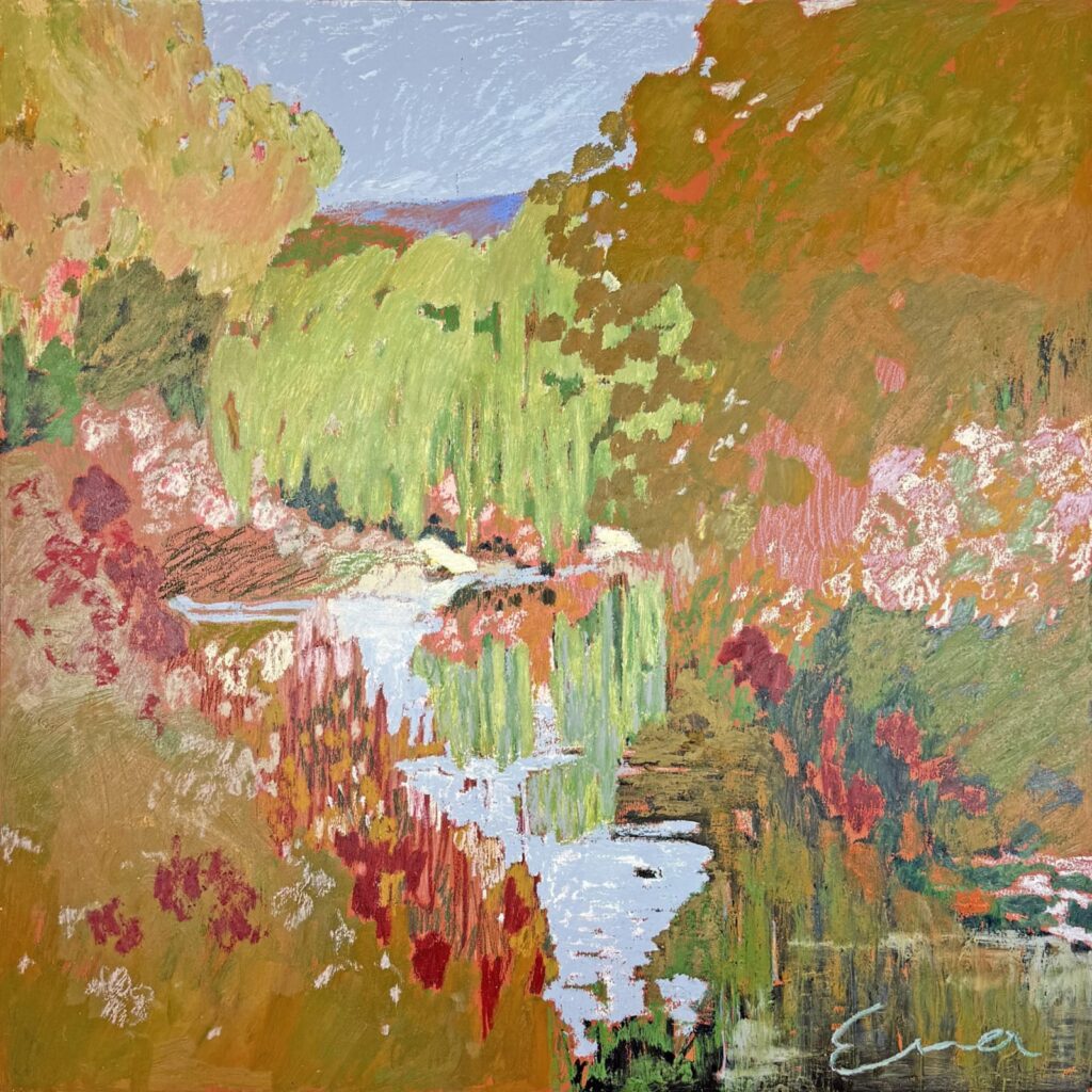 Eva Ray, an emerging artist from Kent, UK, draws inspiration from landscapes, natural forms, and travels—especially in India, where she studies mural and fresco techniques. Her creative process begins with soft and oil pastels on paper or wooden panels, followed by paint. This layered approach results in texture-rich paintings. Works like Camber Gorse and Folk Meadow reflect her love for natural motifs and translate observations into grounded yet ethereal compositions.